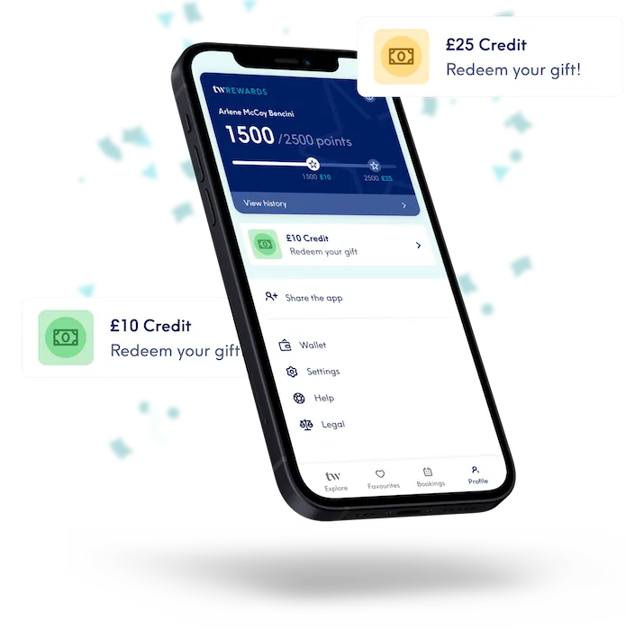Lorsque vous atteignez un seuil de Treatwell Rewards, vous pouvez convertir vos points en bons de réduction de 10 € ou 25 €, que vous trouverez dans la section "bons" de votre profil.